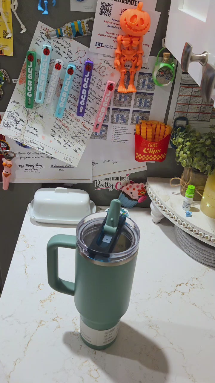 This is the Jug Bug, a water bottle lid wrench for Stanleys! Stanleys are great and water proof but those lids can sure get stuck on tight. This wrench will make short work of it for you! It has magnets so you can stick it to your fridge or microwave for easy access every day.
